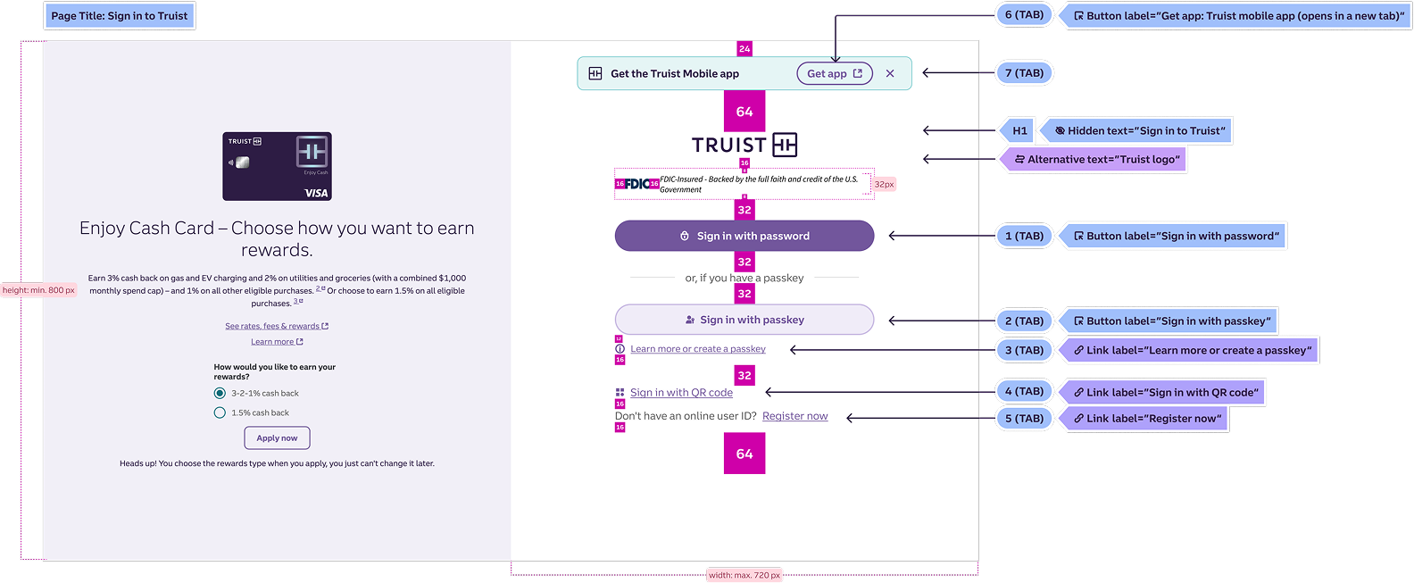 Truist design delivery is grounded in Truist’s in-house design system and accessibility standards. I partner closely with product and engineering to translate research findings, interaction logic, and compliance requirements into build-ready specifications. This includes validating semantic structure, keyboard navigation, screen reader behavior, and visual consistency to ensure designs ship accurately and perform as intended in real-world conditions.